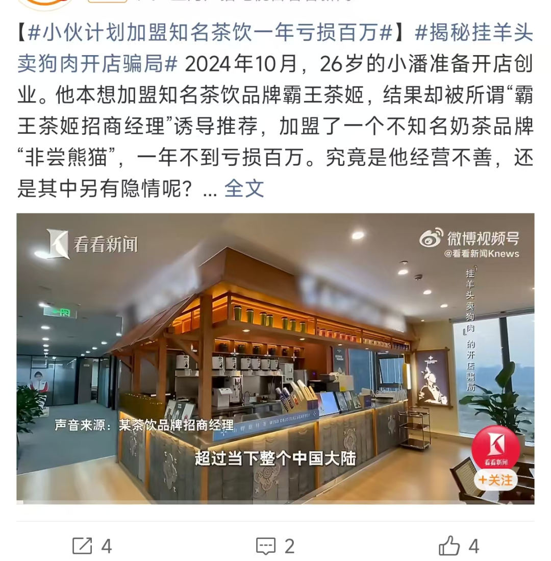 普通家庭出身的26岁小伙,加盟某茶饮品牌,损失上百万。