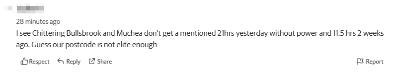 “昨天Chittering、Bullsbrook和Muchea毫无预警的停电21小时,两周前还停过一次11个半小时,可能是我们的区不够精英吧……”