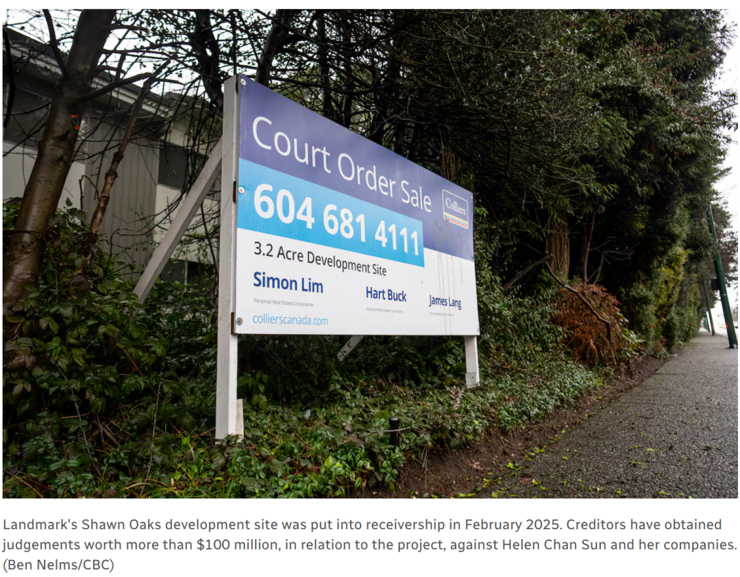 因为这些位于Oakridge Park附近的开发项目陷入停滞,债权人已经对她个人和公司发起了超过1.15亿加币的诉讼。