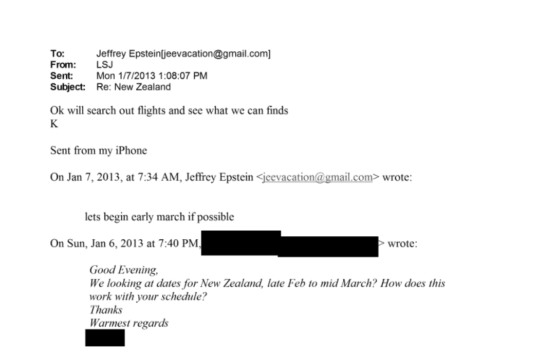 他在邮件中写道:“Jeffrey(爱泼斯坦),Karen和我想在4月请假一段时间回新西兰探亲,是否可以获得你的批准?致意。”