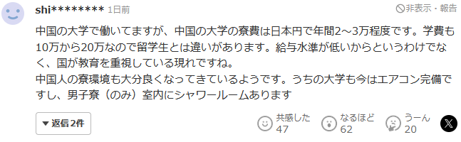 我在中国大学工作,中国大学的宿舍费每年大约是2万到3万日元。学费也是10万到20万日元不等,和留学生有所不同。这并不是因为工资水平低,而是国家重视教育的表现。