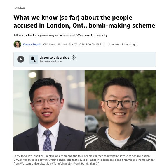 根据警方与法院信息,这四人均为20多岁,其中三人目前居住在靠近西安大略大学(Western University)校园西侧的住宅内。更引人关注的是:四人均就读或毕业于该校工程或理科相关专业。