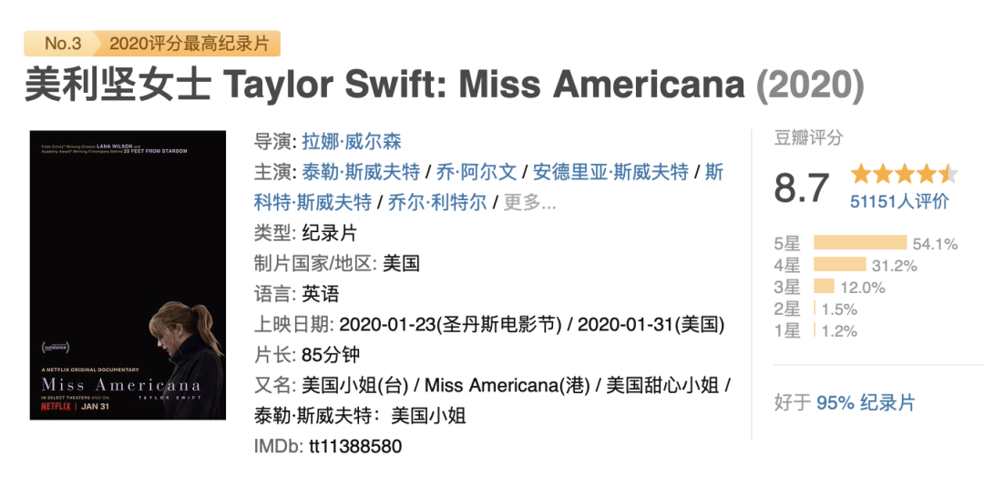 还有泰勒·斯威夫特的纪录片《美利坚女士Taylor Swift: Miss Americana》,无论是烂番茄还是豆瓣,都是高分。