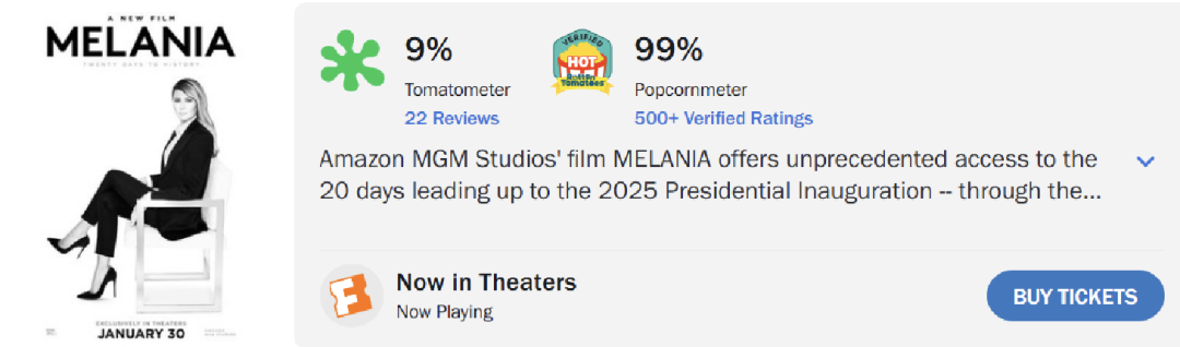 一月的最后一天,美国前总统特朗普的妻子、美国第一夫人梅拉尼娅的纪录片《梅拉尼娅:20天历史》(Melania:TwentyDaystoHistory)在全美影院上映。