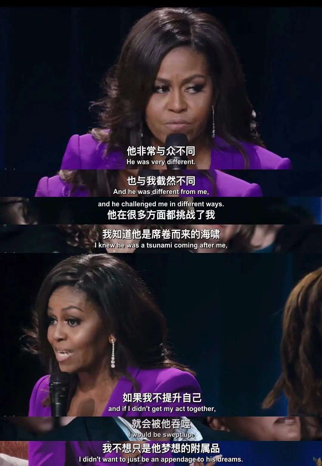 影片中有一幕令我印象深刻:米歇尔提到奥巴马非常强大,如果自己不主动进步,就可能被他的强大“吞噬”。她说:“我不应该阻止他去健身房,而是自己也要去健身房。”