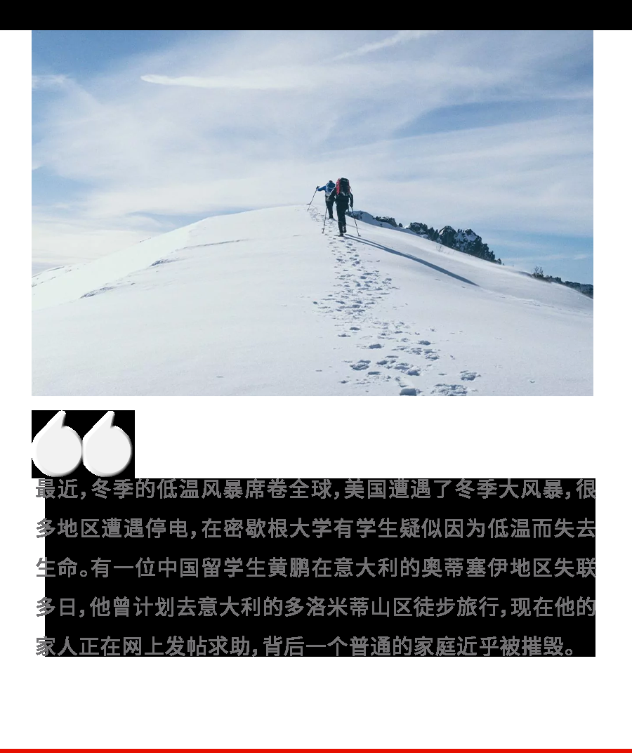 遭遇极端天气时待在家里尚有风险,而去深冬时选择去山上徒步旅行则很容易面临生命的挑战。