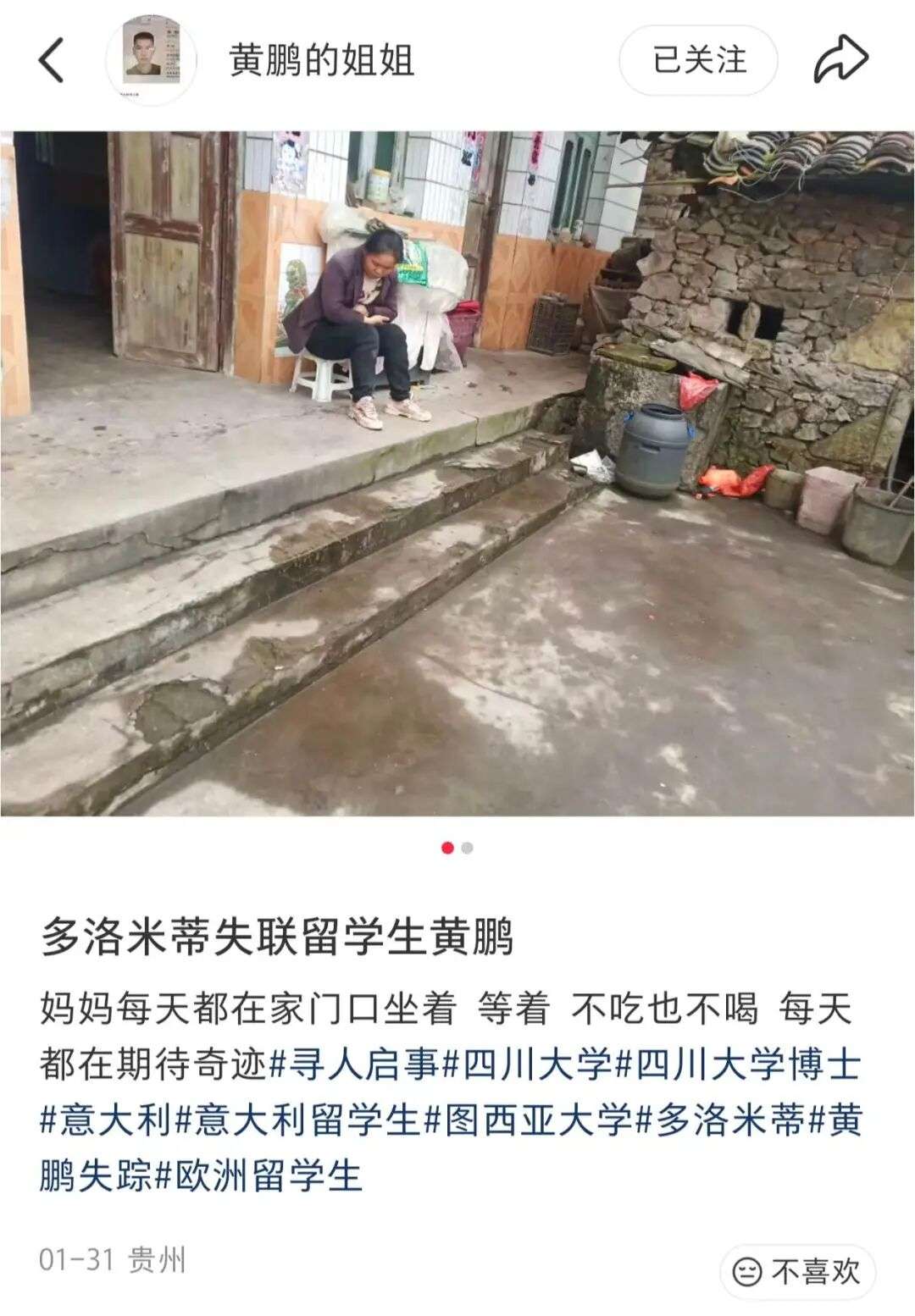 失联者是去年四月去到意大利图西亚大学交换访学的四川大学博士生黄鹏,他最后一次与家人联系是在1月20号。