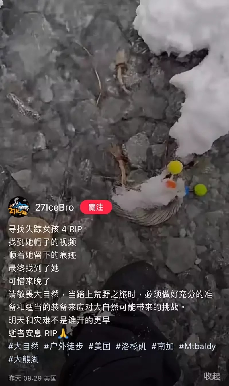 当地参与搜救的志愿者曾经找到了她的帽子,顺着雪中的痕迹找到她,但最终也没能拯救黄乐菲的生命,“可惜来晚了”。