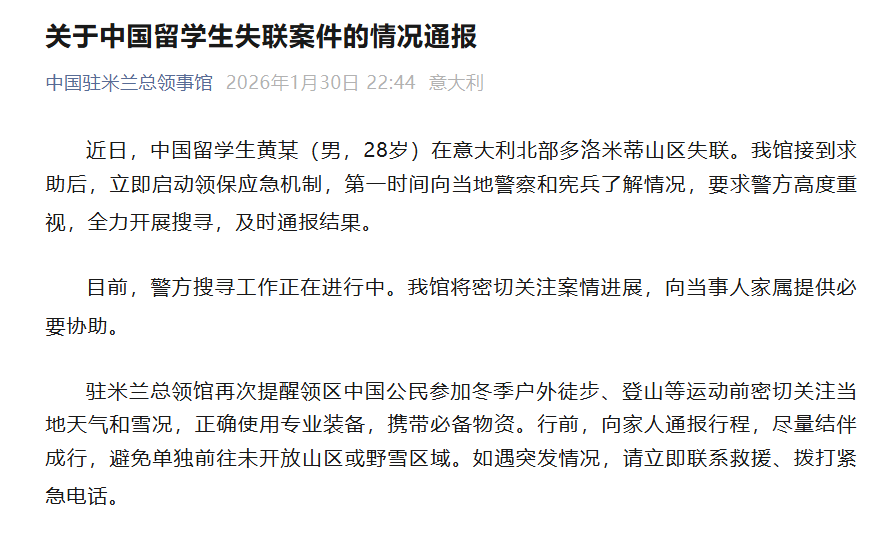 1月30号,中国驻米兰总领事馆发布了相关的案情通报。