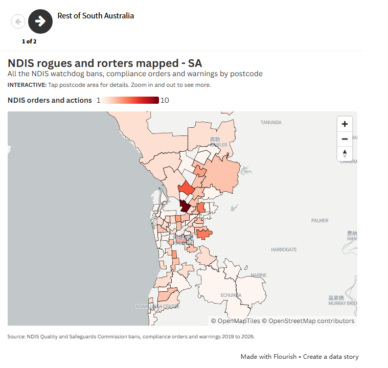 分析显示,涵盖Mawson Lakes、Pooraka 和 The Levels地区的5095 Adelaide邮编区,是南澳针对个人或NDIS服务商采取监管行动数量最多的区域。2019年至2026年1月期间,NDIS质量与保障委员会在该邮编区共发布了10起禁令、合规通知、可执行承诺及注册相关处置。上次人口普查数据显示该区人口约21,400人。