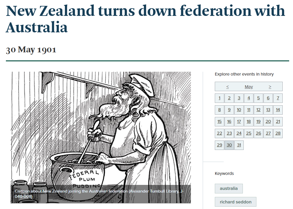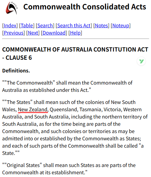 1900年,英国议会通过的《澳大利亚联邦宪法法案》(Commonwealth of Australia Constitution Act 1900)里,第6条明确列出了新西兰可以作为成员州加入。