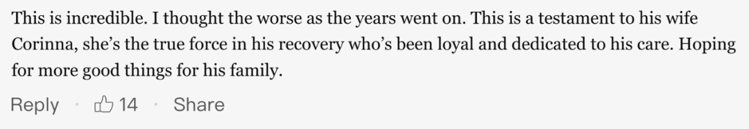 “真是难以置信的好消息。随着时间流逝我以为他的情况更糟了。这是对他妻子科琳娜的考验,她是他康复之路上忠诚的、付出了最多的真正力量。希望这家人能有更好的情况。”