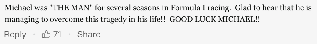 “迈克尔是F1多个赛季里的‘那个男人’。听到他在想办法克服人生中的这个悲剧很高兴!!祝你好运迈克尔!!”