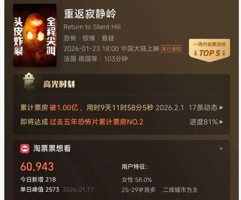 “18岁至35岁人群已成为电影消费的核心力量。”朱玉卿分析,“这一代观众成长于IP(知识产权)文化与类型叙事高度成熟的环境中,他们对心理惊悚、世界观设定和类型混搭具备较高接受度。同时,他们对影史经典与跨媒介IP保持持续兴趣,这为《闪灵》《重返寂静岭》这样的作品提供了现实土壤。”