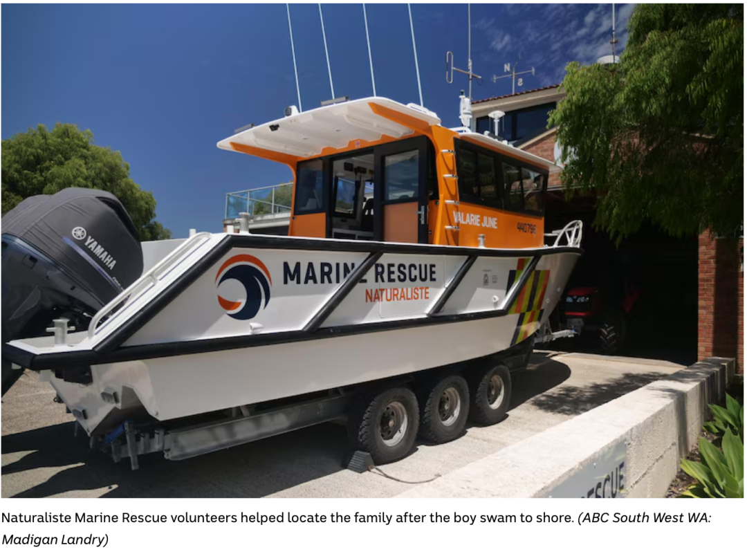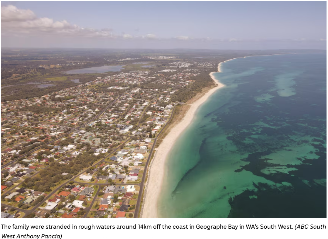 多部门随即展开搜救,包括 WA Water Police、救援直升机和 Naturaliste Marine Rescue。当晚约8点半,救援人员在距岸约14公里处发现Joanne及12岁的Beau、8岁的Grace。