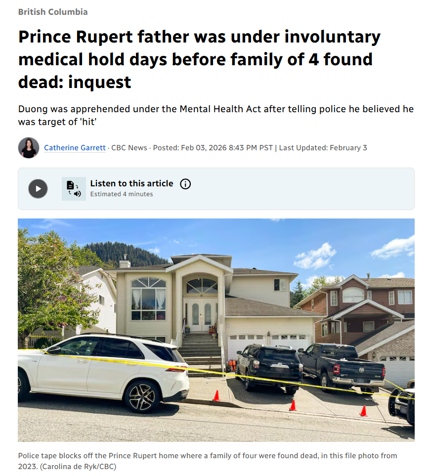 据 CBC 报道,2023年6月13日,克里斯托弗·杜翁(Christopher Duong)、妻子珍妮特·阮(Janet Nguyen),以及4岁的儿子亚历山大(Alexander)和2岁的儿子哈兰(Harlan),被发现死于普林斯鲁珀特市的一处住宅内。