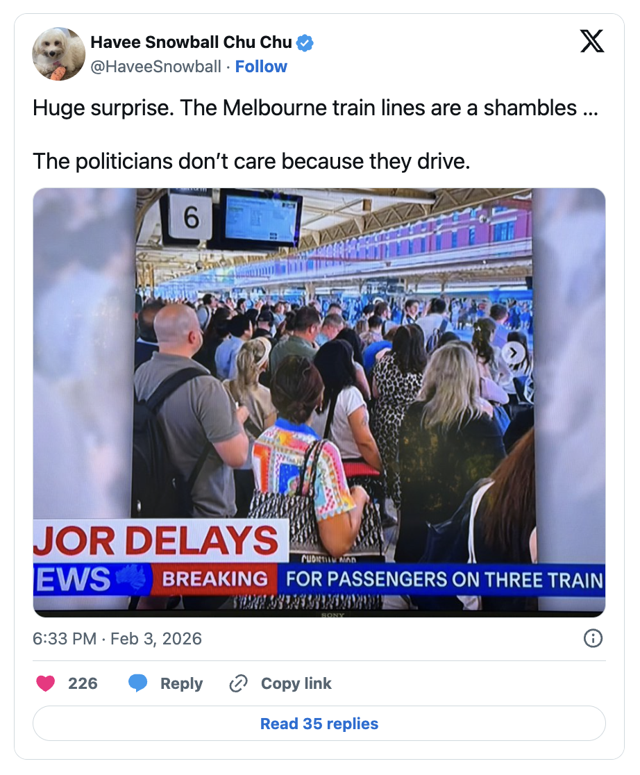 这次事故尤其令政府难堪,因为它发生在州长Jacinta Allan刚刚承诺通过Metro隧道为Cranbourne、Pakenham和Sunbury线路提供“更快、更可靠”交通服务仅仅三天后。