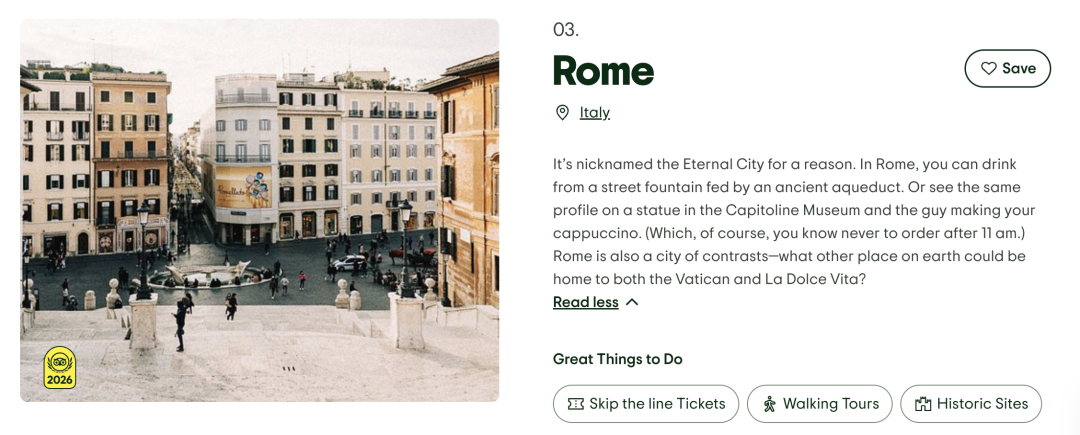 罗马(Rome)被称为“永恒之城”,街头喷泉、古罗马遗迹与文艺复兴艺术交织其中。