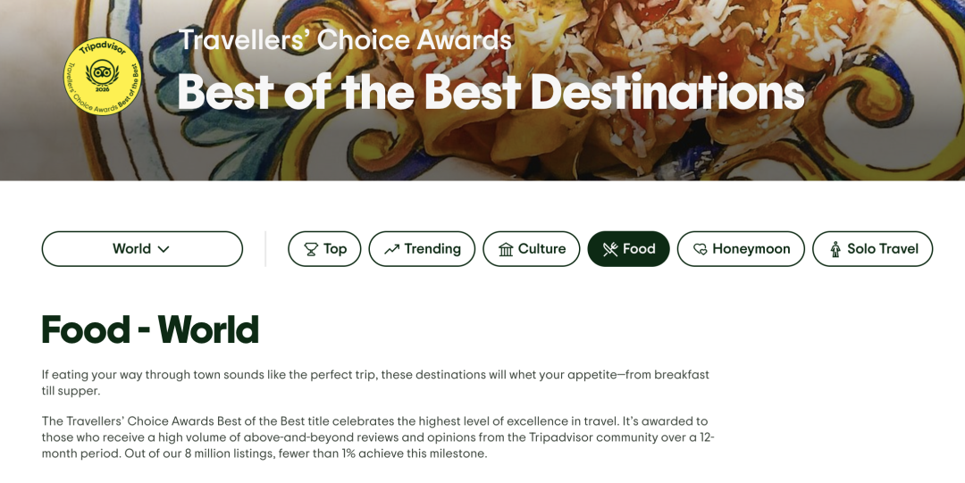 在全球超过800万条旅行和餐饮列表中,能够获得这一殊荣的不到1%,可见其权威性和含金量。