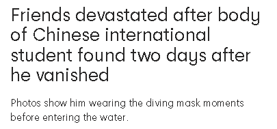一名性格开朗、随和的中国留学生,在悉尼东区不幸溺水身亡。
