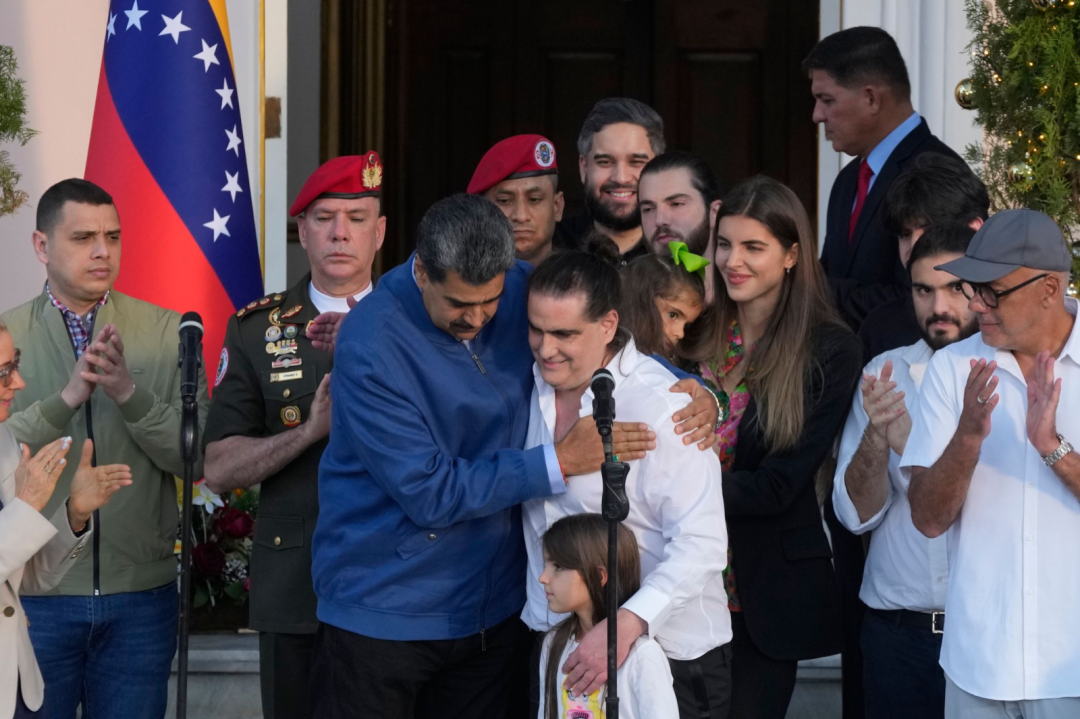 2023年12月20日,委内瑞拉总统马杜罗(前左)与获释的亚历克斯·萨博(前中)会见媒体