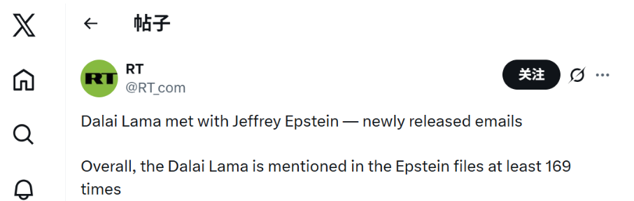 同日,“今日俄罗斯”(RT)在X上发布帖文称,“达赖曾与杰弗里·爱泼斯坦会面——最新公布的邮件。总的来说,在爱泼斯坦的文件中,达赖至少被提及169次”。