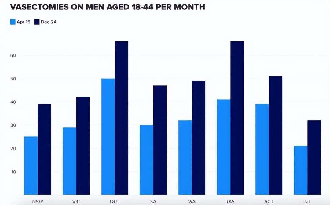 在塔斯马尼亚,每 10 万男性人口中,18 至 44 岁男性每月接受输精管结扎手术的人数从 2016 年的 41 人增加到 2024 年的 66 人,这相当于增长了61%。