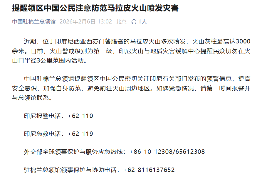 2月6日,中国驻棉兰总领馆发文提醒领区中国公民注意防范马拉皮火山喷发灾害: