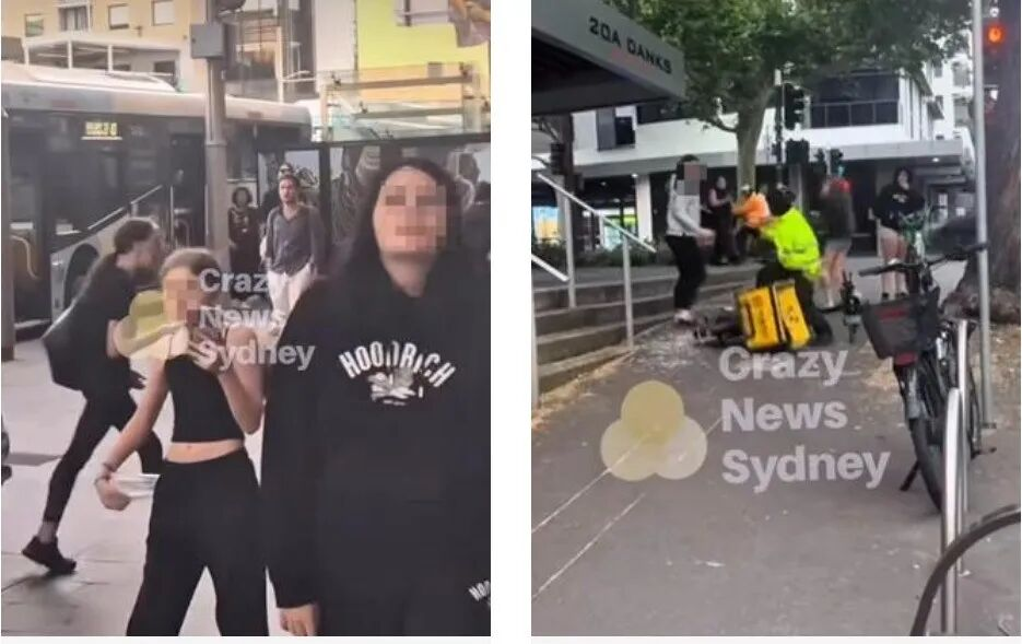 在其中一段视频中,两名少女在街头与一名Uber外卖骑手发生争执,而在另一段视频里,她们在悉尼市中心对路人肆意辱骂。