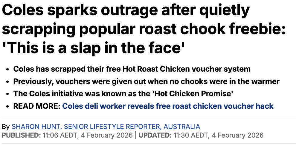 最近,Coles最近悄无声息地取消了一项大受欢迎的福利“烤鸡售罄免费券”,让不少忠实顾客直呼“这是在打消费者的脸”。