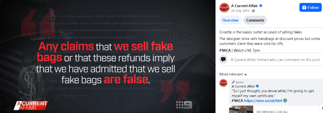 2024 年,市场上一度出现质疑声音,指控 Cosette 销售假冒名牌包。但随后新州公平交易署(NSW Fair Trading)介入调查,最终认定这些指控没有证据支持,Cosette 也因此被洗清嫌疑。