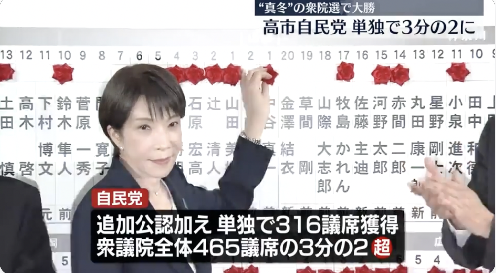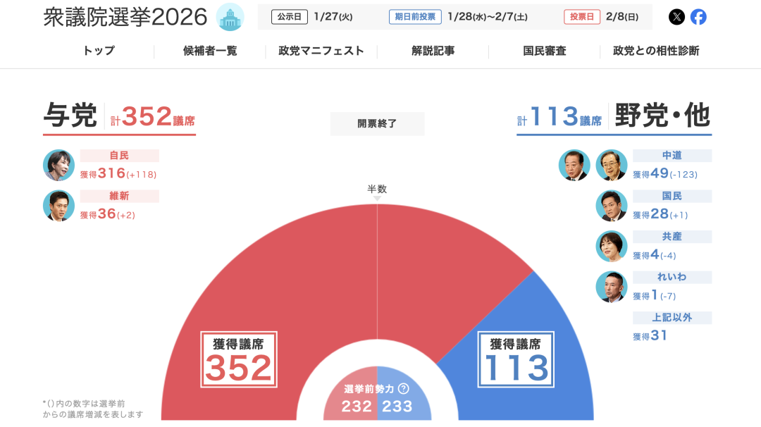 其中自民党获316席、维新会36席,占据众议院(465席)超三分之二的议席,远超现任日本首相高市早苗此前“过半数”的预期目标。