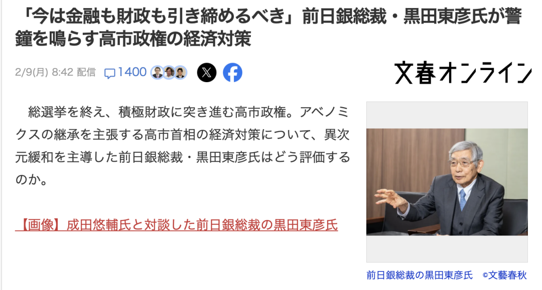 对此,日本前央行行长黑田东彦于近期在接受日媒采访时警告高市早苗,如今日本的金融和财政策都应该收紧。
