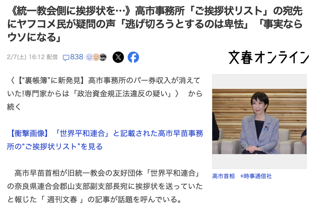 文春推测,这是高市早苗与前统一教会见不得光的关系。