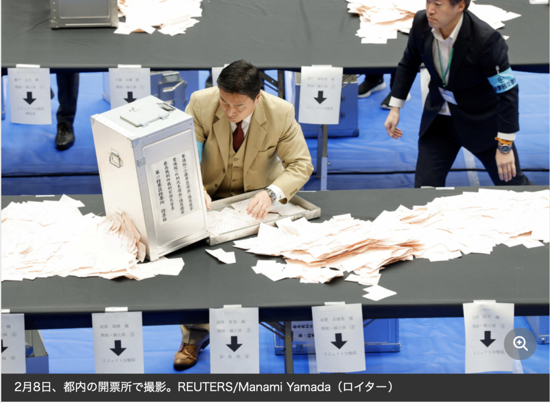 在2月8号举行的第51届日本众议院选举中,由日本自民党和维新会组成的执政联盟共获得352个议席。