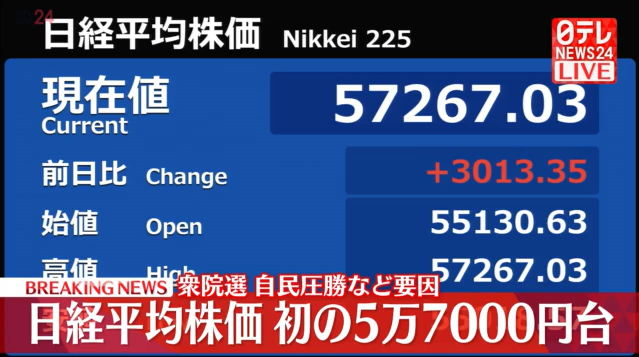 由于执政联盟在众议院选举中赢得过半席位,强化了市场对日本未来经济政策的预期。不出意外的是,选举结束后的次日2月9号,日经平均股指开盘后大涨3000点,而日元持续贬值。