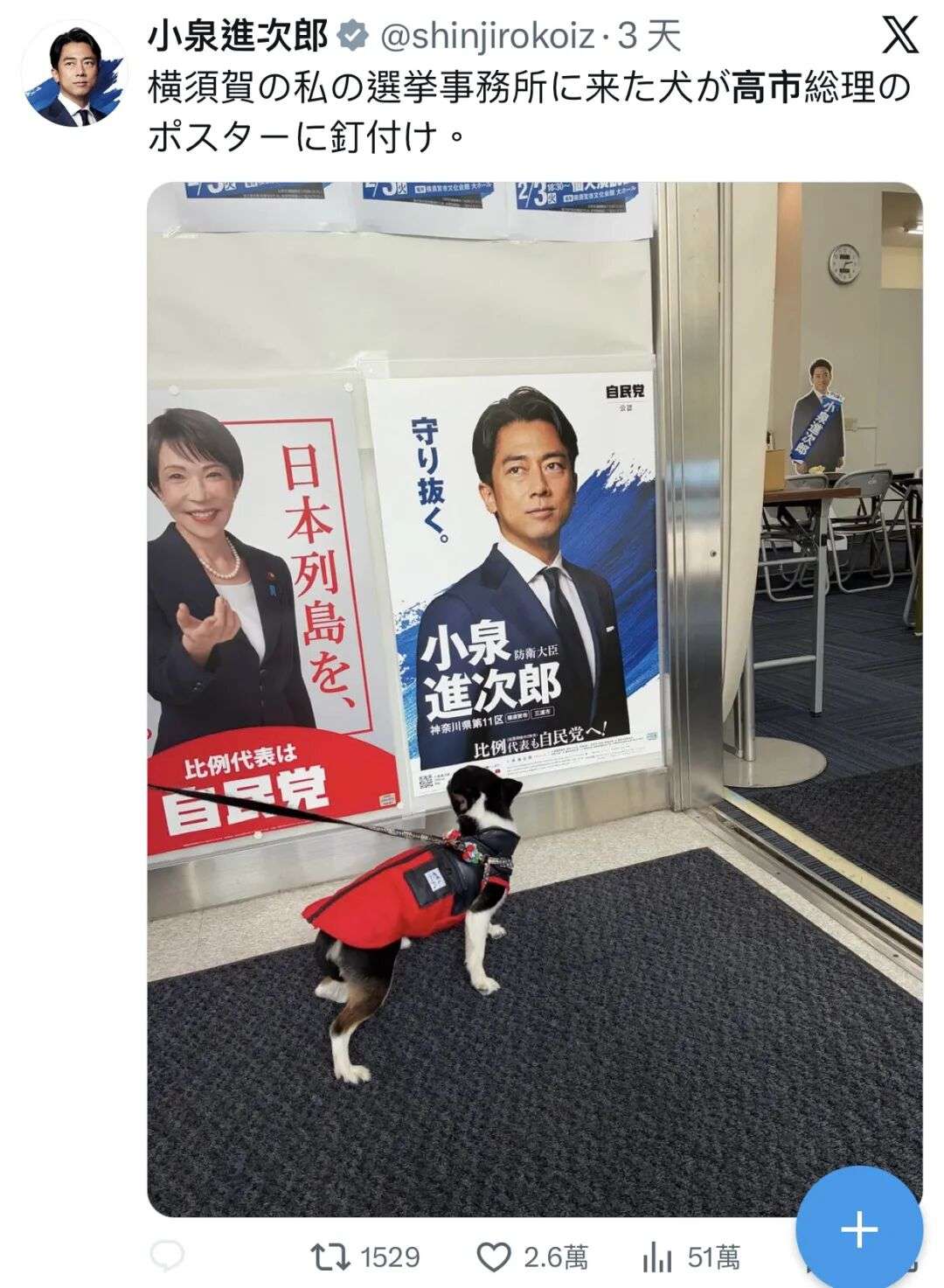 值得一提的是,在本次选举期间,现任防卫大臣AKA废话文豪小泉进次郎在社交平台上发布一张“狗与高市早苗”的图片,他配文: