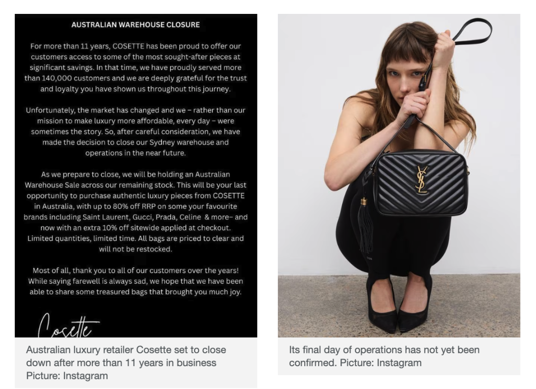 深受很多人喜爱的一家悉尼豪华零售商正式宣布将在近期永久关闭,一条短短的官方声明瞬间在时尚圈引爆话题。Cosette,这个成立11年、曾经让成千上万消费者用折扣价买到名牌手袋和奢侈配件的品牌,突然宣布将关闭悉尼仓库和业务运营,虽然明确表示并非破产或进入清盘程序,但这一决策还是令很多人感到措手不及。