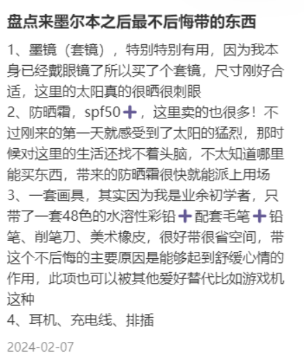 还有中国留学生直接发帖表示,自己最不后悔带到澳洲的东西就是墨镜。因为阳光太刺眼,紫外线强烈的地方墨镜太重要!