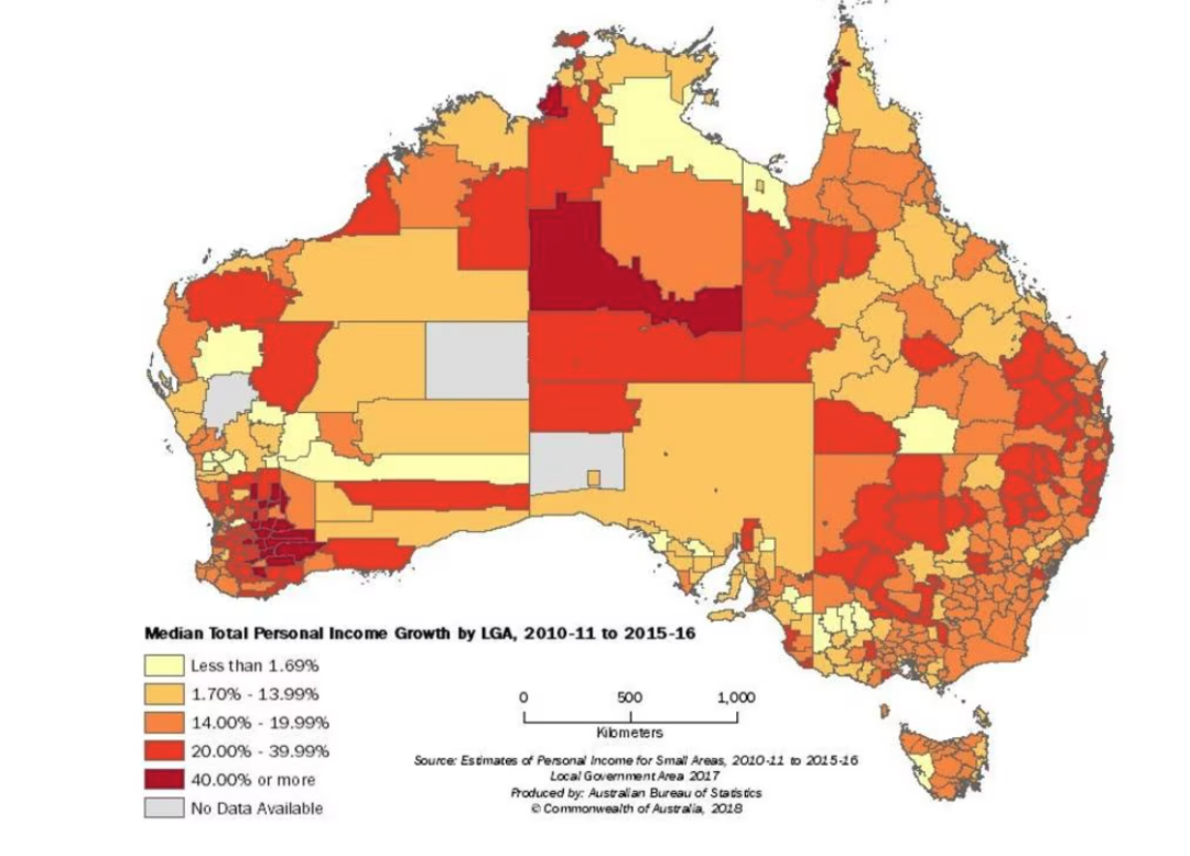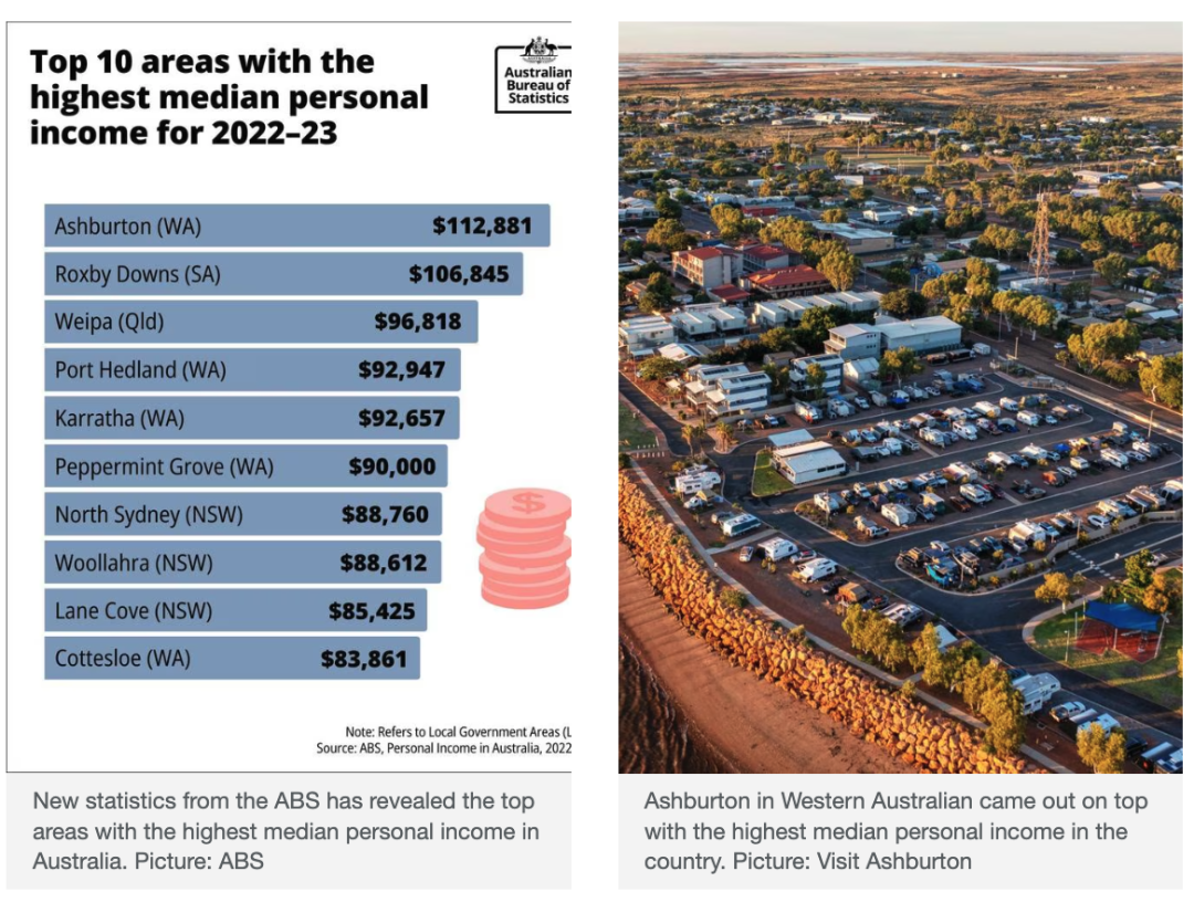 新官方数据出炉,一个让很多人意想不到的现象正悄然揭开了澳大利亚财富版图的新格局。2022–23财政年度,澳大利亚个人收入最高的地区竟然不是悉尼、墨尔本,也不是堪培拉的CBD富人区,而是位于西澳偏远矿区的 Ashburton 地区(皮尔巴拉一部分),在那里中位数个人收入高达 112,881 澳元,远超悉尼等大城市。对于很多习惯把“城市才有高收入”的人来说,这个结果无疑很震撼。