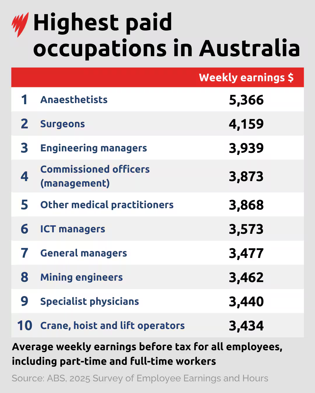 将目光投向具体职业时,情况则有所不同。基于所有雇员(含兼职)的平均周收入,澳大利亚收入最高的职业是麻醉师(5,366澳元),其次是外科医生(4,159澳元)和工程经理(3,939澳元)。