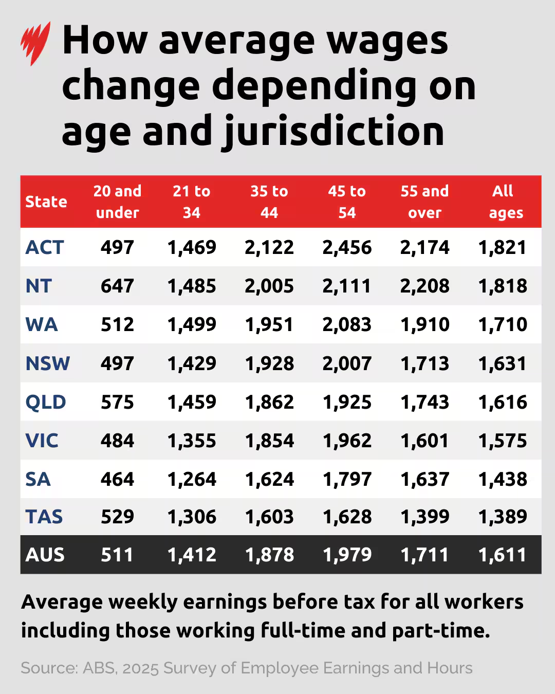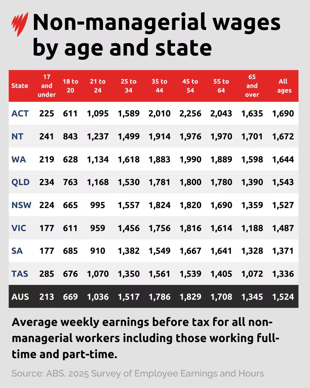 在年龄层面,全澳收入最高的群体是 ACT 地区45至54岁 的员工,平均周薪高达 2456澳元。