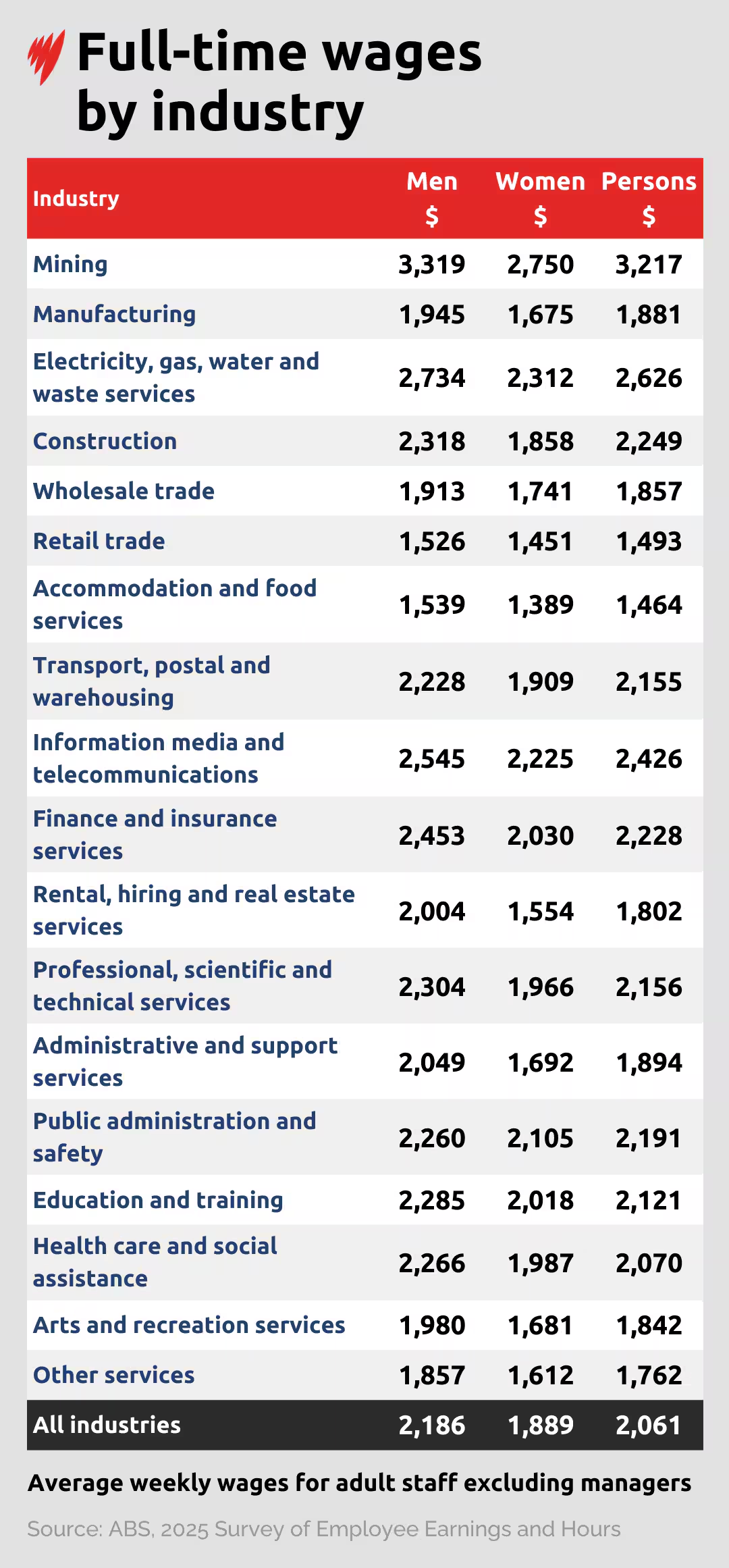 就平均而言,受雇于采矿业的男性是收入最高的全职工作者,周薪达3,319澳元。澳洲收入最高的女性同样出现在采矿业,平均周薪为2,750澳元。