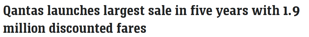 据《news》报道,澳航已启动其五年来规模最大的国内航线促销活动,在25条航线上对190万个座位进行降价销售。此次促销活动于周二开始,持续六天,适用于指定日期内25条国内航线的单程机票。