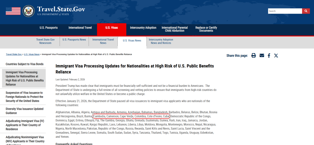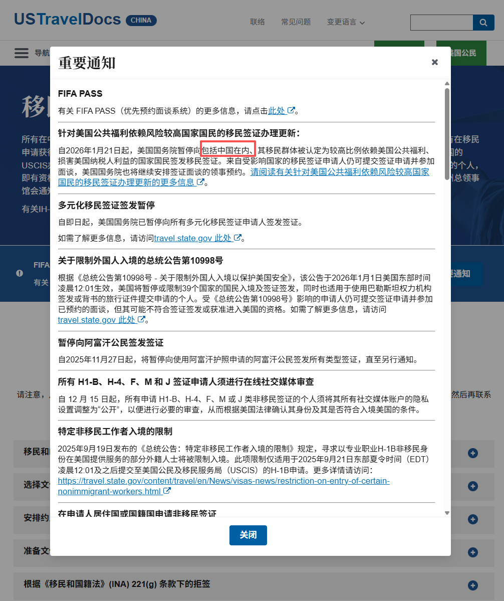 截图显示,自2026年1月21日起,美国国务院暂停向包括中国在内、其移民群体被认定为较高比例依赖美国公共福利、损害美国纳税人利益的国家国民签发移民签证。