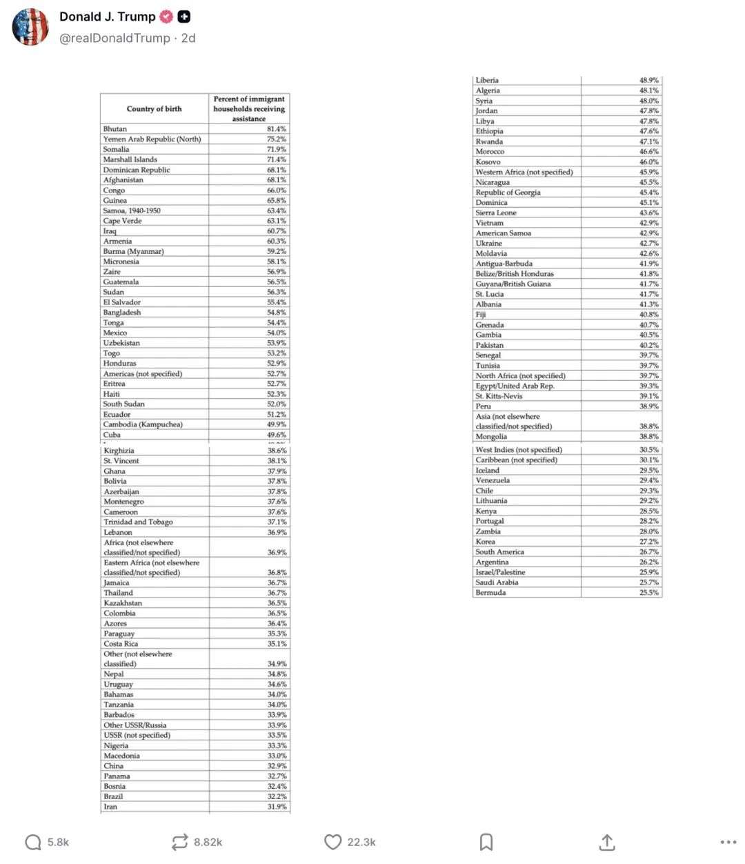 今年1月,川普曾经在社交平台分享了一个图表,显示来自不同国家或地区的移民家庭在美国领取福利和公共援助的比例。图表中罗列出了120个国家或地区,数据一公布瞬间引发舆论轩然大波。