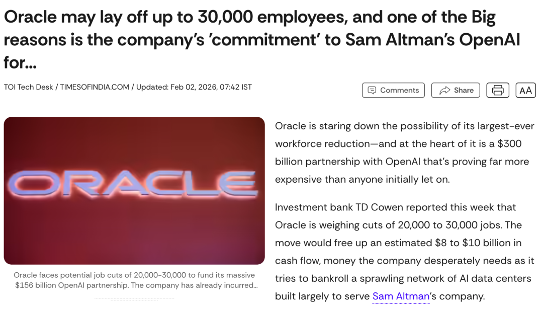 甲骨文试图用 3 万人的生计和公司的信用,去换取一张通往 AI 时代的入场券。但这枚入场券的价格,似乎超出了这家老牌巨头的承受极限。