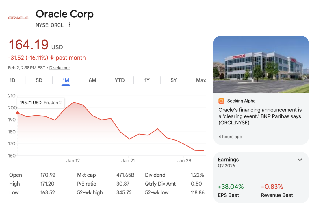 市值蒸发 4600 亿: 资本市场从不相信眼泪。自 2025 年末股价见顶以来,甲骨文股价遭遇史诗级崩盘。市值缩水不仅让拉里·埃里森的身价缩水,更让公司通过增发股票募集资金的路径被彻底封死。