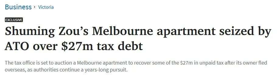 News Corp查阅的一系列文件显示,税务局与72岁的Shuming Zou展开了一场追缉。Zou于2019年11月悄然离开澳大利亚前往中国,此后未再返回。这场追缴最终以查封并强制拍卖Zou位于墨尔本Docklands的公寓告一段落,该房产定于周四进行拍卖。