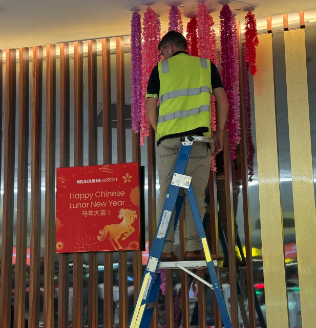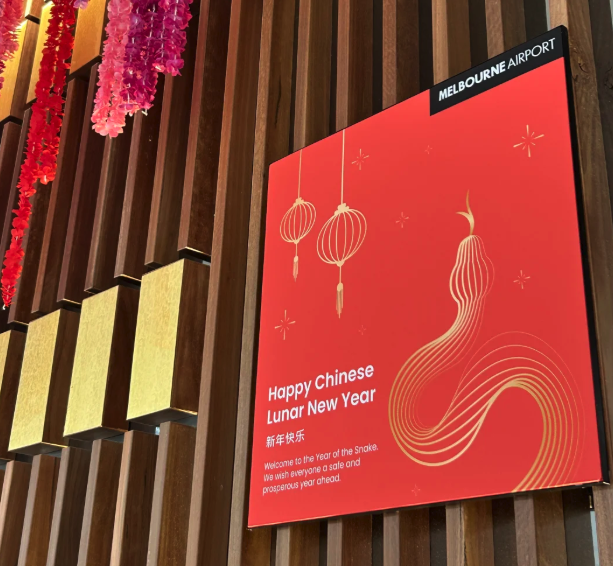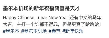 “墨尔本机场的新年祝福简直是天才,Happy Chinese Lunar New Year 还有中文的马年大吉,主打一个谁都不得罪,但是更爽了哈哈哈!”
